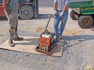 STEP 1: Wearing work gloves, remove damaged or displaced pavers with an old screwdriver or a pry bar and clean all debris from the area. STEP 2: Place a layer of sand down, using a wooden float, push into all corners. STEP 3: Spray water on the exposed sand base. STEP 4: Tamp down the sand with a tamping tool or compactor. STEP 5: Add a thin layer of fine sand, water lightly and tamp again until the sand layer is very slightly above the bottoms of the other pavers. STEP 6: Check the level of the sand base with a spirit level. STEP 7: Beginning in a corner of the open space, install one of the pavers. Match up the chalk markings and replace the new paver. Tap on the paver with a rubber mallet until it is flush with the adjoining pavers, and check it with a level. If not pick up the paver, and add or remove sand below for any necessary adjustments; replace the paver. STEP 8: With the mallet, gently tap the sides of the paver so that it is snug against all adjoining pavers. STEP 9: Install remaining pavers in the same way. By using a screwdriver, make sure there is an even gap between pavers. Pour sand on top of pavers, so gaps are filled evenly. Using the mallet, tap the pavers in, then sweep the excess. STEP 10: Sprinkle fine sand over the repaired area and sweep the sand into the cracks. Rinse the entire surface.