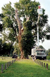 Previously Witt removed an oak tree that had been casting menacing shadows for several years. It was vast, rotting and had lost its last leaf the season before. The headstones of many soldiers would have been damaged if the tree were to fall and time was limited. Mike Witt volunteered his services in mid-July, when the weather was hot and he also had to deal with the presence of a hive of bees in order to remove the tree.
