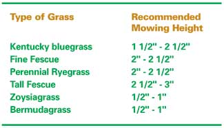 Improper mowing can have damaging effects on both the health and quality of the lawn, which can make the question of catching versus thatching moot. The two most important aspects of mowing are proper mowing height and proper mowing frequency. Selecting the correct mowing height depends primarily upon the species of grass in the lawn. The appropriate cutting heights are listed to the right.