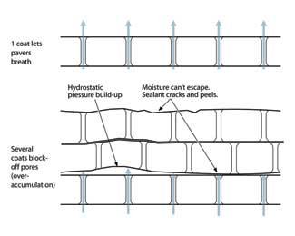 While there is a virtual cacophony of marketing claims to wade through, one easily identifiable truth is that when it comes to stain protection, with today?EUR??,,????'???s technology, a film-forming sealant is superior to a non film-forming alternative. Put another way, a physical barrier on top of the pavement offers ultimate stain protection. That however, is where the simplicity ends. Due to the flexible nature of an Interlocking Concrete Pavement, it?EUR??,,????'???s important that a film-forming sealant should likewise be able to move with the pavers without peeling or cracking. Further, because the joints allow penetration of water into the bedding layer, which introduces backside moisture, a film-forming sealant must be breathable at the microporous level in order to allow water vapor to escape while still protecting against stains. A film that can?EUR??,,????'???t breathe will trap that moisture and turn hazy or white, leaving customers displeased to say the least. In addition to pavers, many natural paving materials are subject to the same conditions depending on base and jointing materials.