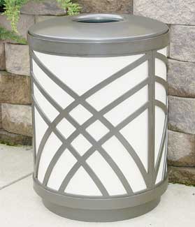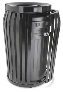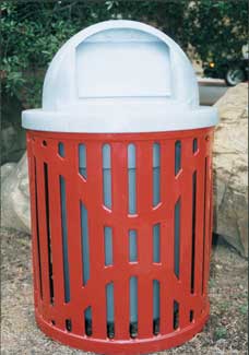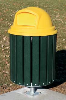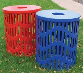 Many styles and colors of lids top off the containers to provide collection points for trash and recyclables. Identify your school, park, golf course, program or donor with an engraved name or message in colorful filled letters on plastic slats. School colors, company colors or the landscape theme colors can be incorporated into the receptacles and lids to make trash collection more appealing to the public. These made-for-outdoor receptacles include heavy gauge steel frames and welded construction for maximum durability. Steel and plastic lids can resist the abuse of constant exposure to weather and the public.