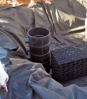 Tank Module Installation- The cylindrical pump vault and its associated plumbing were then placed in a convenient position to be connected via the downspout filter box to the nearest downspout. The actual structural support for the tank comes from 85% recycled polypropylene framework modules (termed tank modules by the manufacturer) capable of supporting 38 psi.