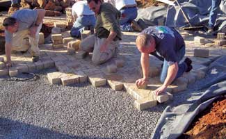 Pavers- Pavers could now start going in while insuring a 1/4?EUR??,,????'?????<????????????????? (7mm) joint was maintained. Once the necessary cuts to accommodate borders were made and all pavers laid, they were compacted true to grade and free of movement. A thin layer of more ASTM No. 8 or No. 9 aggregate was then spread across the surface before the pavers were again compacted. Once the excess had been swept away, the hardscape was complete.