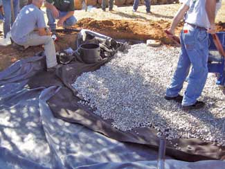Bedding Course- With the water storage basin in place and open graded aggregate covering the top supported by a geotextile, it was time to put in the bedding course. Hard, angular material meeting the grading requirements of ASTM No. 8 or No. 9 was used in a uniform layer screeded to grade with a depth of two inches.