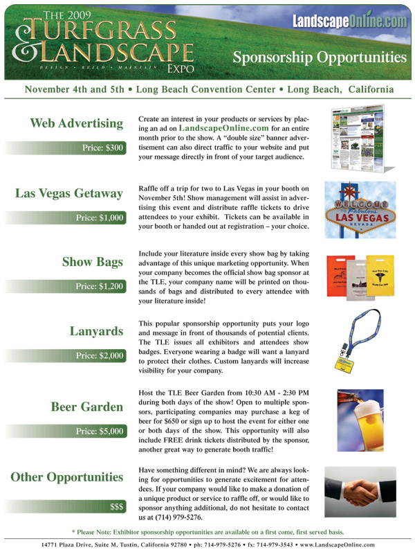 Click Here to view a list of the 2009 Turfgrass and Landscape Expo Exhibitor Sponsorship Opportunities.
