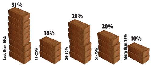While 70 percent of landscape contractors make 50 percent or less from hardscape projects, 42 percent indicated that the percentage of their work coming from hardscape work has increased, while only 18 percent reported a decrease, which would seem to indicate that hardscape work is increasing relative to other landscape contractor niches.