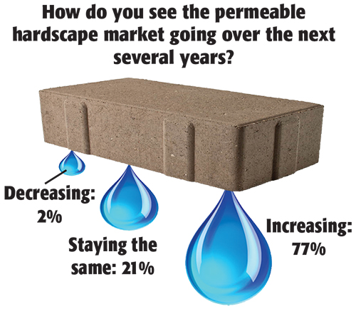 While hardscape installation seems to be increasing, most contractors see permeable hardscape as the trend of the future (77 percent of respondents see the industry moving that way). Hardscape professionals who have not yet embraced permeable surfacing should consider learning more about it.