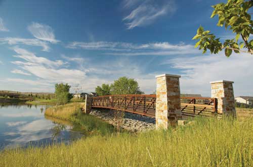 DTJ Design provided visioning, planning and landscape architecture for this community's open space areas and parks. Preservation and enhancement of drainage corridors, cottonwood groves and views to the Rocky Mountains were critical to the design. Other supporting drivers were links to regional trails, incorporation of water features, outdoor gathering areas and strong ties to the architecture. Good pedestrian connectivity was essential. Onsite trails were woven though seating areas, grasslands and tree groves, as well as crossing the wetlands by a bridge for minimal impact.