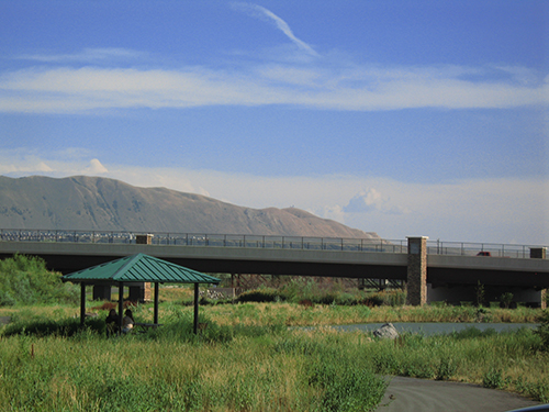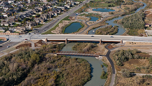 This design-build project added an interstate interchange, five miles of new arterial road with landscaping, and several new bridge crossings. HDR landscape architects designed aesthetic treatments for the bridges, bridge parapets and sound walls. Panels on the bridge picture the area's wildlife. The interchange is landscaped with rock arrangements and arid-climate plantings. The new pedestrian bridge over the Jordan River now connects two trails. The work also included roadway drainage and cross drainage enhancements close to the river.
