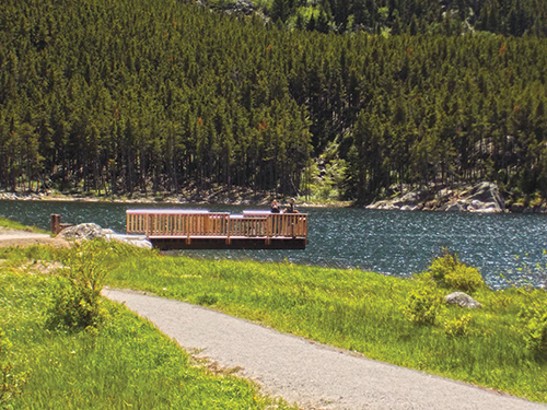 PPL Montana, which operates a hydroelectric dam in the West Rosebud drainage of the Beartooth Mountains, made recreational improvements around West Rosebud Lake. Peaks to Plains Design was hired to design and provide construction administration. The project included redevelopment of a boat launch; a regraveled parking lot and improvements to a second lot; graded and replacing old timber parking bumpers with local boulders; and open-celled pavers to allow growth of natural vegetation. The firm also engineered an accessible trail, routing it through grass and juniper cover, around a delineated wetland area, while nestling the trail around large field boulders. The trail ends at a custom-designed cantilevered fishing pier over a popular fishing hole.