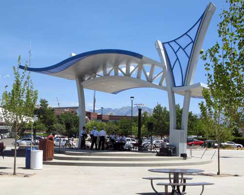 This $1.5 million multimodal plaza offers a performance canopy and stage and water feature. The plaza is used for public events, including a farmers' market. Stanley Consultants' Denver office provided urban design services and overall project management; the firm's Salt Lake City office was responsible for civil engineering. The performance canopy was developed in collaboration with renowned Tucson artist Barbara Grygutis. This significant transit-oriented redevelopment includes connectivity to downtown Salt Lake City via bus and rail lines, and to adjacent retail, commercial and residential districts. The design style and materials reflect the values and contemporary direction of the city.