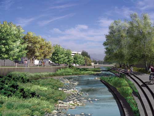 As part of the consulting team responsible for preparation of the Los Angeles River revitalization master plan, Wenk Associates led conceptual design elements along the river's edge for the 32-mile river corridor. The plan is to make the river corridor a green amenity, preserve or enhance flood control functions and natural elements, provide additional parks and open spaces, create a continuous greenway trail and provide opportunities for development to orient toward the river. The plan is a 25-50 year blueprint for comprehensive improvements. Most river reaches exhibit flow velocities too high to sustain vegetation. Maintaining flood capacity and slowing flows are necessary for ecosystem restoration and safe public access. Terraces, ramps, small pocket parks and ponded areas enhance public access. The long-range goal is to reintroduce vegetation to support birds and mammals, and ideally, restore steelhead trout habitat.