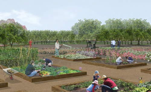 Adjacent to the existing Farm + Food Lab, the Community Garden will feature 99 plots, including six that are ADA compliant. There will also be an open turf area with a large shade tree and picnic tables for the gardeners.