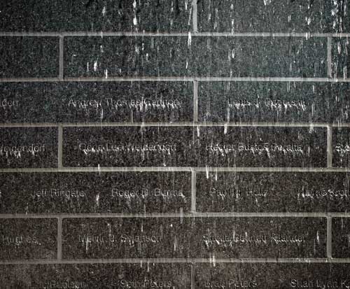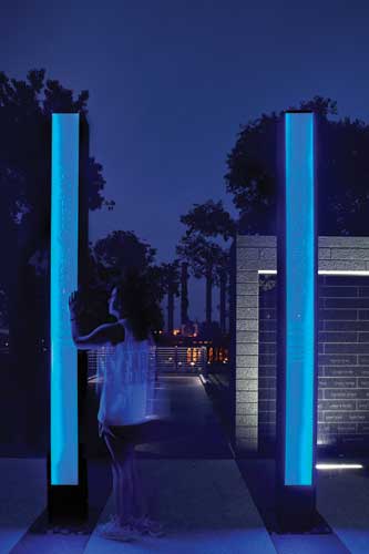 As the grade of the adjacent pathway falls two feet on the west side of the plaza, a set of solid stone steps rise out of the grade. A phrase recognizing the event, those who survived and those who responded is carved into the face of the top riser. Solid granite benches with inset Ipe wood tops are at either end of the plaza. A mass planting of variegated Moore grasses front the plaza. Behind the columns at the back edge of the terrace is an 8-ft. high and 31-ft. long black polished granite water wall, the Survivors' Wall. A quote in raised stainless steel letters embodies the underlying values of the memorial. The water wall is illuminated by five in-grade linear Bega 8840 20-watt asymmetrical white LED lights set flush into water jet cutouts in the four-inch thick granite paving. The names of the 151 survivors who were on the bridge when it collapsed are engraved on the polished stone face of the wall. A thin sheet of water flows quietly over the polished surface creating a meditative environment. The water falls into a bed of black stones where it is collected and recirculated. The four ft. wide stone path that connects the terrace to the river overlook is lit along one side with four in-grade Bega 8671 2.5-watt white LED lights.