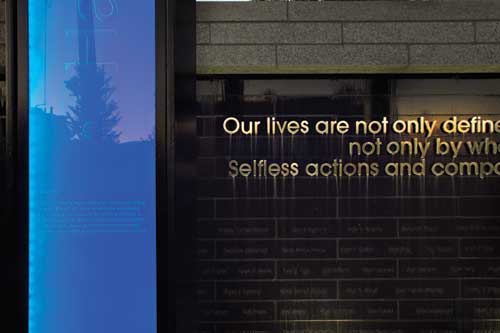 The iconic feature of the memorial design are the 13 10-ft. tall steel I-beams and glass columns, one for each of the victims of the collapse and referential to the original bridge construction. oslund.and.assoc. worked with a local fabrication shop to fabricate a full-size mock up of one of the light columns to fine tune the design before fabrication of the 13 column lights.The custom steel and opaque glass columns are edge lit with TivoTape static outdoor LEDs at 1.05 watts per linear foot. The tape light is set into an aluminum channel that holds the LED light strip and the glass into the web of the I-beams. Each glass column is engraved with the name of the victim and a personal message written by their family, some in their native languages. A blue color blue was selected for the light columns for its calming quality and symbolization for inspiration, sincerity and spirituality. The columns remain lit at all times.
