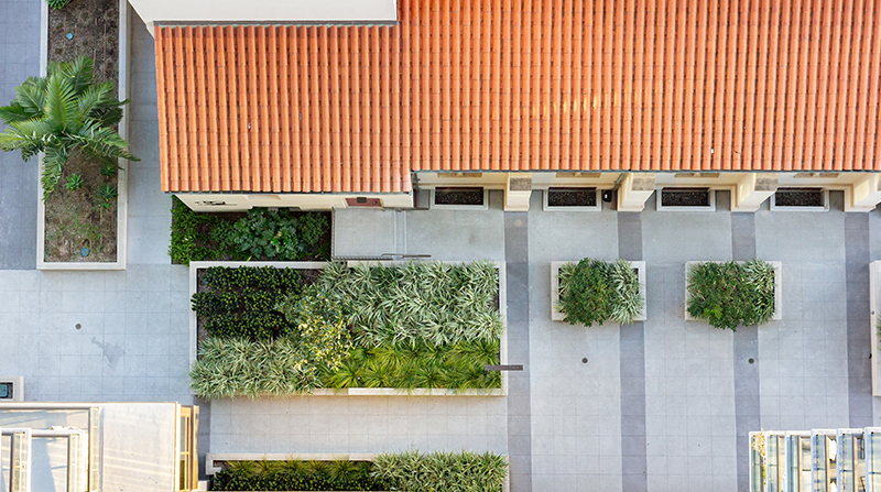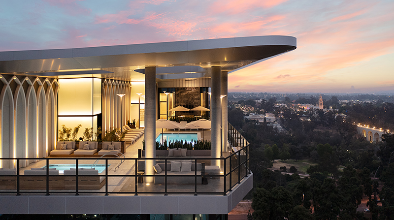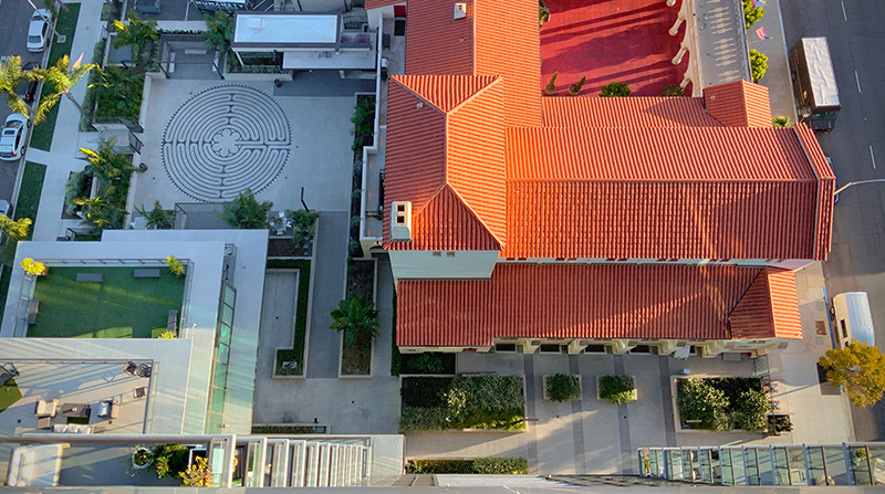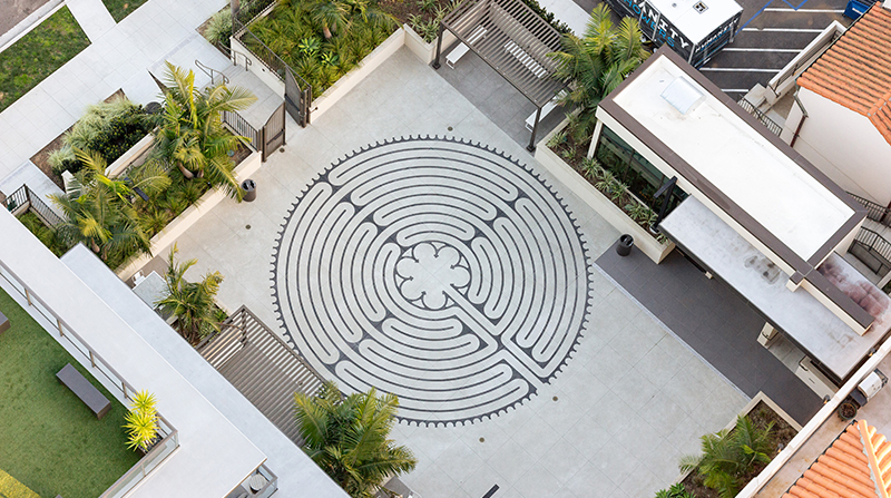 525 Olive is a 20-story mixed-use residential tower designed to complement the adjacent historic St. Paul's Cathedral in the heart of San Diego. As the Landscape Architect, Urban Arena led all phases of the project, from concept through construction administration, crafting ground-level streetscape improvements, a publicly accessible ground-level courtyard, and a rooftop pool deck. Hardscape design played an integral part in unifying the contemporary tower into the site's historic context. At the heart of the ground-level courtyard lies a custom labyrinth, designed as a contemplative space that honors the spiritual legacy of the Cathedral. Formed using sandblasting templates, concrete stains, and surface retarder finishes, the labyrinth offers a subtle yet meaningful pattern that encourages reflection and pause. Careful coordination with concrete subcontractors during construction ensured crisp execution and high-quality finish. Paving patterns throughout the site also establish connections from vertical architecture to landscape design. Bands of contrasting integral color concrete, aligned with cathedral columns, are used to set raised planter locations and connection points from the contemporary tower to the historic cathedral.