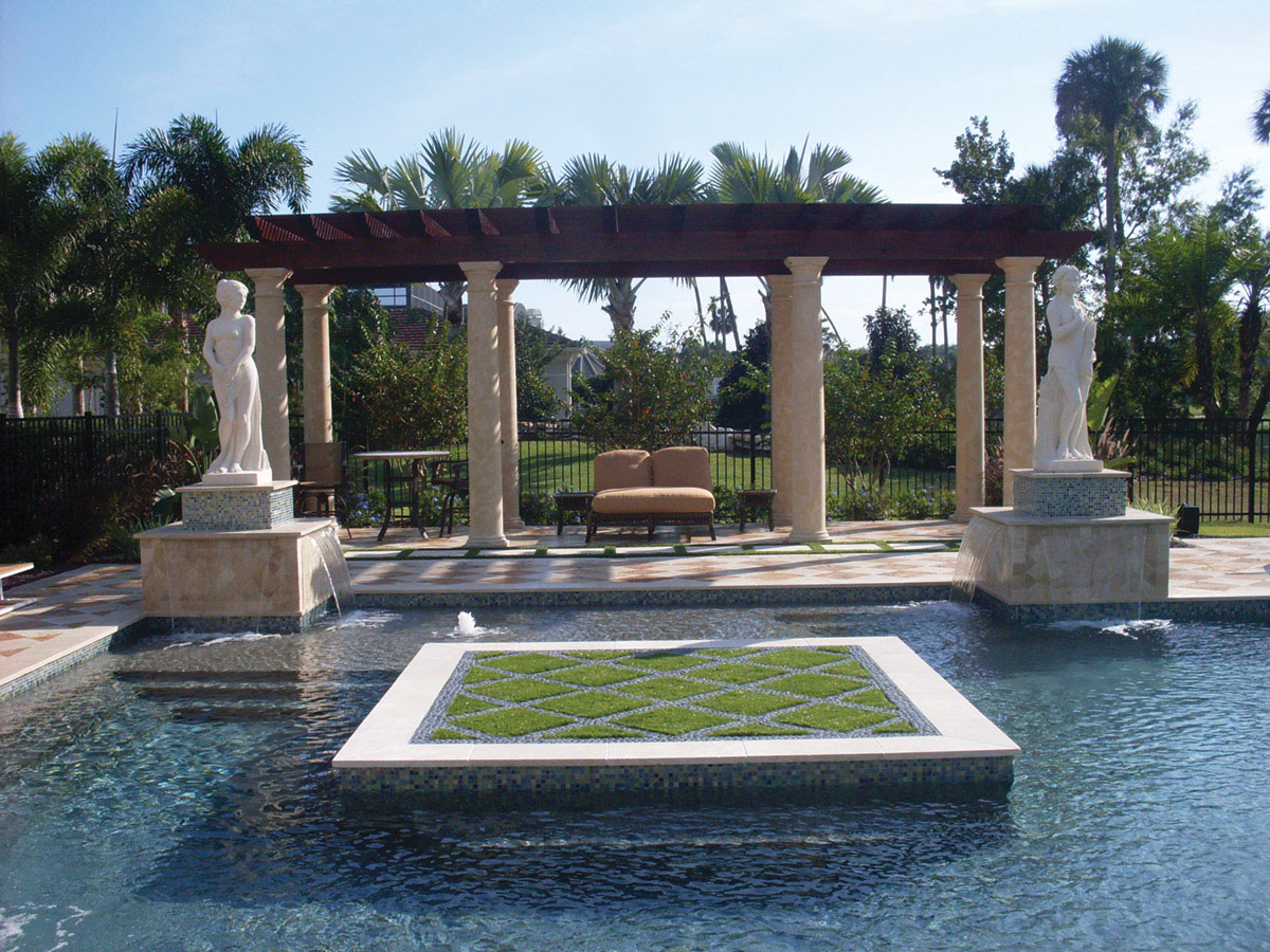 The owners of this home in Longwood, Florida wanted a somewhat transitional Mediterranean style with a resort like feel for their roughly three-acre outdoor space that sits on a lake and golf course. The Landscape Architects at Redmon Design Company worked with the clients to create a rich and cohesive design that complemented the architecture of the home. The driveway, pool and terraces were all designed with a traditional European layout, following the axial design of the property, with all garden elements sourced from their sister company, Alfresco Living.