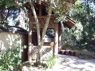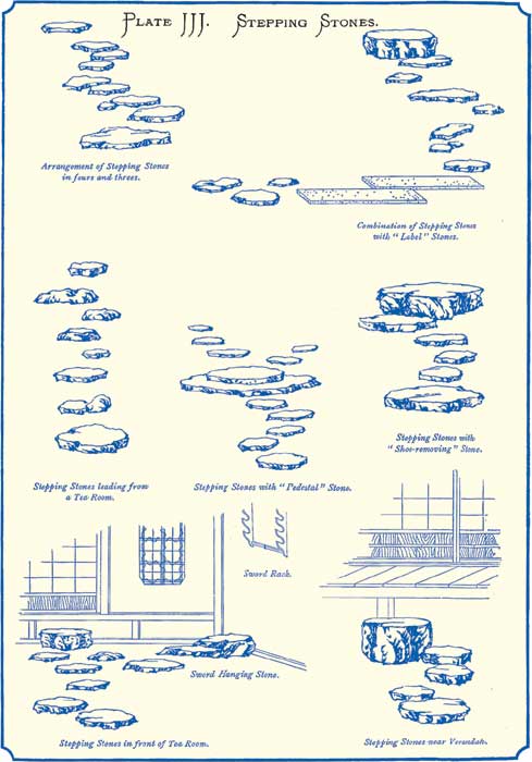 Bridges are often simple slabs of stone used singly or in combinations of two or three spans as seen in this garden. These slabs are frequently natural, uncut stones, which together with the upright stones that usually flank the ends of the bridge should be considered part of the general “stone aesthetics” of a garden. In some instances, the bridge is actually part of a dry landscape, spanning only a sand or gravel stream. Other bridge types include simple wooden structures (kibashi) sometimes consisting of logs laid parallel to one another and supported on a truss-work frame. The Chinese arched bridge (or “full moon bridge,” engetsukyo in Japanese) also survived into later periods and was sometimes employed in the same garden in which rustic slab bridges were found.