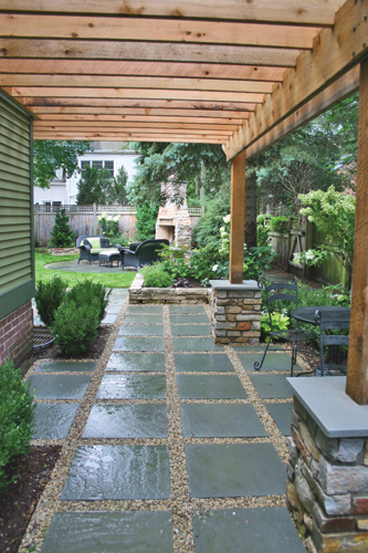 This Kenilworth, Illinois project was a bit of a challenge, as Heffernan Landscape Design had restrictions by the village. The lot was small by neighborhood standards and the house occupied a big footprint. No structure of any kind was allowed within six feet of the fence (including the tails on the pergola rafters). So the contractor had to redesign the pergola to attach to the house. They were able to just squeak by with impervious surface maximums, and had to keep the fireplace a minimum of 15 feet from any neighboring structure.