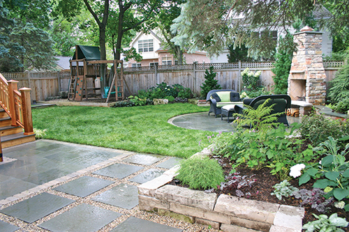 The homeowner's mandates were to include a fireplace with a sitting area, do something with the side yards that were eyesores, make the entrance into the yard welcoming, and reduce the impact of the play set that overwhelmed the center of the lawn. They also wanted to smarten up the existing deck with a pergola.