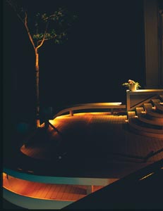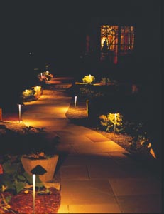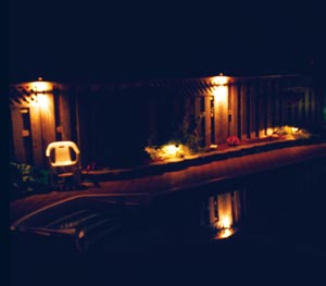 The pool area of the backyard, a main area of interest at any home, is lighted with path lights that are placed in a planter that surrounds one side of the pool. The path lights and lights atop the fence draw attention to the various plant species that inhabit the planter. The pool itself is lit with fiber optics while assorted well lights spring up throughout the rest of the backyard.
