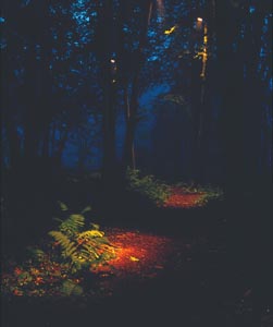 Walking on the dock, back towards the stairs, is a large oaktree. Fenton sat in the house at night and looked at the setting before him and figured out how to make the most out of lighting the tree.