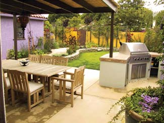A mixed sandstone path using two colors of sandstone meandered through the colored concrete dining and driveway areas, connecting the kitchen door with the new Spanish-style gate at the back of the garden. The visual break provided by the flagstone path made the entire concrete-covered space seem less monolithic, and thus more organic. Within the grass area, the actual six-inch step down is accentuated by these seat-height (16 inches to 18 inches) surrounding broken concrete walls, making the grade change feel more dramatic. Tall-growing plants encompassing the grass area further enhance the feeling of seclusion.