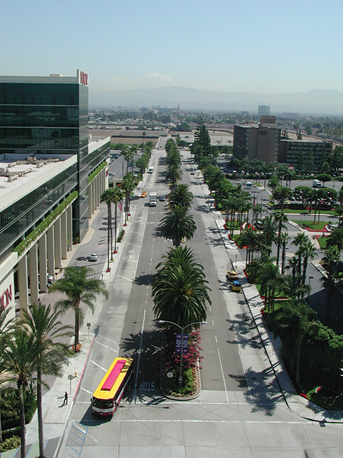 The plaza design is representative of the agricultural roots of Anaheim and Orange County, and the Southern California landscape, complete with three fountains, a "River-of-Light," Valencia orange trees, date palms and focal sculptural elements. Through the use of state-of-the-art energy-efficient lighting and control systems, the Grand Plaza is the go-to venue for an exciting, festive nighttime experience. One of the major design challenges was finding a balance between pedestrian activity spaces and vehicular traffic, including public transit, private vehicles and fire/emergency and service/delivery vehicles. The removal of vehicular traffic from the plaza enriches the public's experience. The Grand Plaza in essence expands the convention venue to the outside, complete with areas for exhibit booths/tents; rest and reflection; utility for hot and cold concession stands; opportunities to hold street fairs and receptions; and a "stage" for live outdoor concerts and entertainment. The Grand Plaza is defined by four distinct areas: 1) The main Grand Plaza extends from the Convention Center east on Convention Way, and is closed to vehicles at the traffic circle at Hotel Way; 2) North Palm Court was completed as part of the Convention Center expansion in 2000; 3) South Palm Court, which mirrors North Palm Court, is a transition area between the Grand Plaza and the Transit Plaza; and 4) Transit Plaza, located on the south side of the Convention Center with connection to West Street where bus, taxi and delivery service to the Convention Center and the Marriott Hotel is available, creates a more efficient transportation flow. The design concept for the Anaheim Convention Center Grand Plaza is based on the historic evolution of Anaheim. Fifty Bavarian families settled here in 1857. These were farmers and wine-making immigrants who considered the area their "home by the river." "Ana" is a reference to the Santa Ana River; "Heim" means "home" in German. To the Spanish-speaking neighbors already established here, the settlement was known as Campo Alem????(R)?n, i.e., "German field." When insect infestations destroyed the grape crops in the 1880s, the Germans shifted their focus to walnuts and citrus, most notable orange trees, for which the county was named. When Los Angeles and Orange County became connected to the continental railroad in 1886, Southern California oranges became a prized national cash crop.