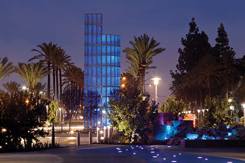 The blue, meandering pavement pattern that connects the fountains at each end of the plaza is a metaphor for the Santa Ana River, flowing from the mountains to the sea. The "River of Light" paving pattern simulates the flow of water and the sparkle of light reflecting off its surface. Almost 300 individually controlled in-grade luminaires along the length of the plaza pulsate in sequence between each of the three fountain elements for a dazzling light display. A different show can be programmed for presentation every half hour. The design team worked with Targetti/Poulsen to develop modified versions of their Icare and Phoenix DMX controllable RGB in-grade LED luminaires, and also with Electronic Theatre Controls to assemble the over 1,500 channels of control. The result is a landscape of light "flowing" organically from one fountain to the other. Themed water features anchor each end of the Grand Plaza "river," with a smaller water feature at the central fountain plaza, creating a visual link between the Hilton and Marriott hotels. These water features are sculptural, focal elements, metaphors for Southern California mountain and beach landscapes.The Grand Plaza "Ocean Fountain," a reflection of the iconic tower on the convention center, is an impressive upward projection of water composed of three cascading water levels. The fountain, just outside the convention center, has amphitheater seating for concerts, small venue events and just plain people watching. LED light strips under the poured-in-place amphitheater seat walls and at the fountains create a light shadow and soft light glow, emphasizing the form of the fountain and echoing the curvilinear forms of the convention center building. The "Ocean Fountain" lighting has a vast color-changing system that also controls the fountain pumps and jets.