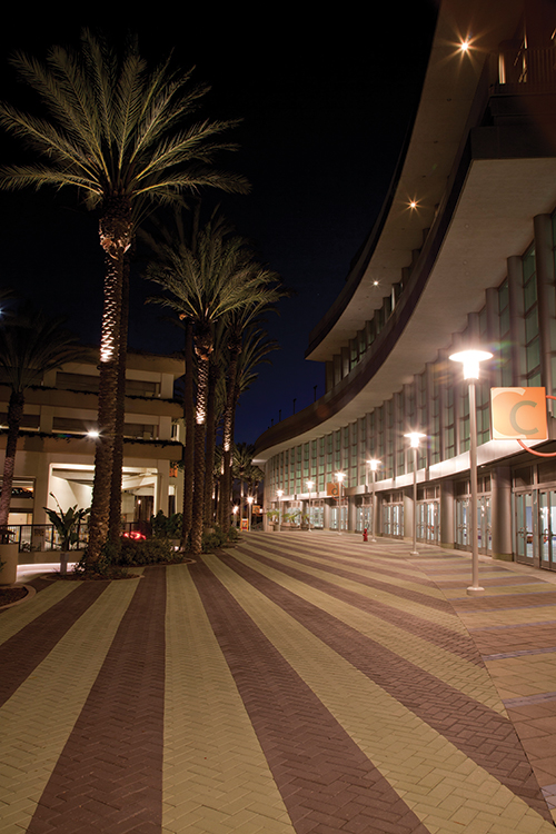 At the east end of the Grand Plaza, the traffic circle is designed to relieve congestion on Convention Way and Hotel Way by allowing a more fluid traffic flow. The 45-foot entry marquee tower at the traffic circle is a beacon that anchors the east end of the Grand Plaza. An internal color changing system illuminates and animates the tower to welcome visitors from around the world to the Anaheim Convention Center. The metal sculptural element in the center of the roundabout is a smaller-scale replica of the Convention Center Tower, yet provides a dramatic arrival statement. It serves as a "front door" sign, identifying the Anaheim Convention Center. The Anaheim Convention Grand Plaza represents the most current use of architectural and landscape lighting design technology and sustainability. Lighting and electrical requirements were complex, requiring careful consideration of aesthetics, function, operations, maintenance and budget.