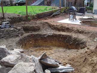 On the other side of the planting bed, Hartman and the homeowners decided to put a small pond with a short cascade. The crew started by creating a three-foot-deep hole. Some ponds are shallower, but the team wanted this water feature to be deep enough to let fish survive under winter ice in a state of dormancy. (An electric coil placed on top of the ice in winter lets the pond breathe in freezing weather.)