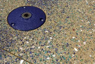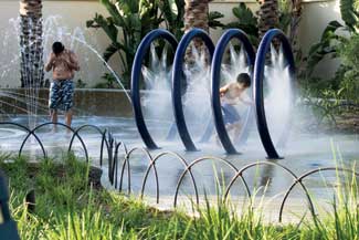 Adjacent to the lagoon pool, a wading pool lets little persons get their toes wet, while mom and dad relax under the canopy of nearby shaded tables and chairs and observe their aquatic forays. Immediately adjacent to the wading pool is an interactive water garden, with both off-the-shelf and custom features. Special pavement has been designed to reflect the aquatic theme of this play area.