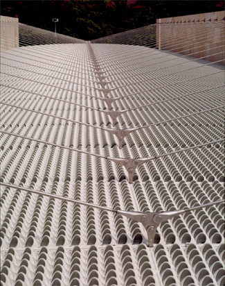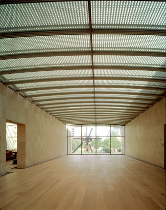 To create a ?EUR??,,????'??seamless flow of space?EUR??,,????'?? between garden and gallery, designers, Piano and Walker collaborated to give the indoor gallery an ?EUR??,,????'??outdoor feel.?EUR??,,????'?? Inside, the gallery?EUR??,,????'???s long, parallel walls of smooth, Tuscan travertine divide five, equal-sized pavilions. Glass facades, enclosing each end of the pavilions, allow the galleries to visually extend, providing an unobstructed, continuous view from the street, through the building and into the garden. Warm sunlight seeps through a semi-transparent, barrel-vaulted ceiling built by supporting delicate panes of glass on narrow steel ribs held by thin, stainless rods. A custom designed cast-aluminum sunscreen floats above the glass allowing the bright sky to filter down into the gallery giving it a ?EUR??,,????'??roofless?EUR??,,????'?? effect.