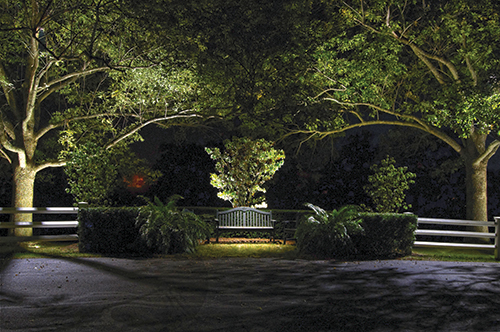 Private Estate in Mt. Sterling, Ky. Red Oak Design As a key aim for this installation, Red Oak Design was asked to illuminate the area where the driveway meets the walk leading to the front door of this private residence in Mt. Sterling, Ky. The bench provided a great focal point as it sits directly across from the walk. Red Oak installed one Hadco hanging fixture with an Illumicare LED lamp from a branch of one of the ash trees above the bench. Two Kichler LED integrated downlights, one fixture per tree, each with a frosted lens and a long cowl to reduce glare, were used to highlight the drive. Well lights were installed at the base of each of the large ash trees to focus on the texture of the trunks, with four Kichler accent/uplights illuminating the trees' canopies. Two of the uplights were mounted on the backside of the fence, which, being elevated, are better protected from damage by the property's maintenance crew.
