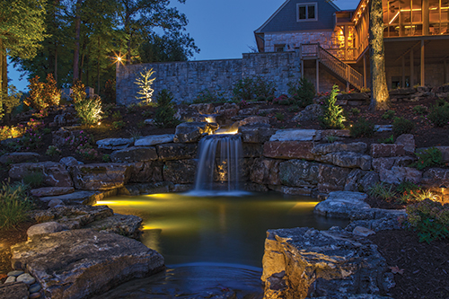 Backyard Upgrade in Evansville, Ind. Aching Acres Landscaping Inc. Along the Ohio River in Evansville, Ind., homeowners on a 100-acre property with a 25-acre lake in the middle commissioned Aching Acres Landscaping Inc. to upgrade a backyard with 15 years worth of overgrown trees and brush. After months of planning, a five-person crew, including company owner Dan Fuquay, took 18 working days to terrace the yard, install over 500 tons of weathered limestone ledge rock and boulders, 300 yards of brown bark, 1,200 plants, a paved sitting area with a fire pit, a water feature that includes ponds, falls, streams and a 1,000 GPH pump; then illuminate it all. The lighting system comprised 1,500 watts worth of transformers and over 100 fixtures of various styles. Kichler and Vista instruments uplight mature oaks and beech trees, different underwater LED spotlights make the water feature glow, and Vista path lights accent other areas.