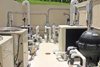 Colored, flush-mounted fittings were employed for the return and suction lines and for the spa jets. The tiles camouflage the fittings and lines, giving the inside of the pool an uninterrupted, uniform appearance.