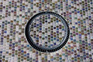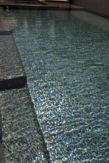 For the pool finish, the designers went with an all-glass tile supplied by Sicis, an Italian manufacturer. David Tishman worked up several blends using three different types of tile and presented them to the clients on sample boards. They selected a blend of mostly beiges and browns, with a few grape-purple pieces mixed in.