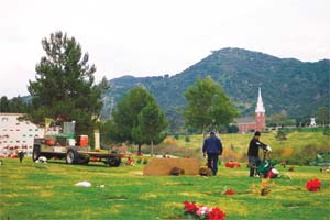 “Nothing can interfere with the interments,” David notes. “When a funeral group passes by the workers, they must stop what they’re doing.” For this reason, the crews start at 6:00 a.m., two hours before opening time. When the park closes at 5 p.m., the irrigation commences.