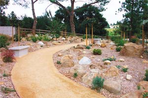 We stop at a new experimental area, the “Woodlands.” Here is a crushed granite path meandering about a rocky slope. On closer inspection, these are mostly faux rock and beneath them are various sizes of vaults for cremains. It’s an attractive alternative to the typical columbarium. No one’s remains are here yet, but there is a name plate on one rock as an example.
