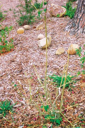 As we walk the Woodlands, we notice several shredded plants (butelons). “This is not good,” David says. He points to the wood fence at the top of the Woodlands, bordered by cherry laurels. Deer have prevented the laurels from filling out the top of the ravine. “The deer scrape their antlers on the trees,” he explains. I ask about using Deer-Off, but he says the property is just too large, plus the rains will wash away the repellent.