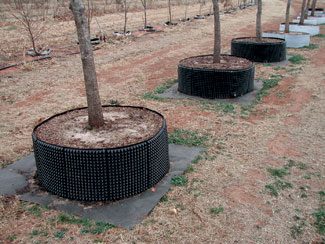When catalpa trees were grown in identical white containers but one was lined with smooth plastic while the other had the capacity to trap root tips and stimulate root branching, root development was very different following transplanting. Having roots poised to grow horizontally from most of the vertical side of the root ball has distinct advantages but especially in restricted growing spaces.