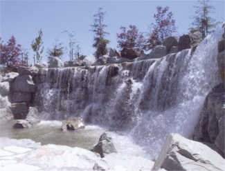 The largest of the falls required 550 tons of natural rock, over 100 cubic yards of concrete, and took 11 weeks to complete. There are three different pools, two streams and a total of 12 springs coming through the moss rock sidewalls. The uppermost pool is six-feet deep with a five-foot drop into the second pool. This was a technical challenge because the site had to be constructed over a man-made hill with a railroad tunnel running underneath. The key to creating this very natural looking waterfall was to make the water ?EUR??,,????'?????<?dance?EUR??,,????'?????<? all along the 120-foot journey down to the five-acre, man-made lake.