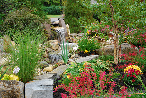 The LA Group, located in Saratoga Springs, New York, donated all of the landscape architecture and site planning services for the Meditation Garden. Many of its features are based on Mallozzi's wishes. Mike Ingersoll, RLA, CLARB, ASLA and vice president of The LA Group, volunteered to design the intimate retreat. The small pond and water cascade are run by an Aquascape BioFalls series 2500 kit. It has a Tsurumi eight-horsepower pump, a 30' x 100' pond liner with a 10' x 100' waterfall-stream liner.