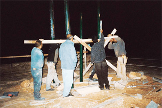 But the workers are inventive. They built a brace from wood scraps, as lumber is scarce. Poles are placed, a deck is attached, and work continues after sunset under the illumination of a single light. The center section is completed, and a brace holds the cement footings to set over night.