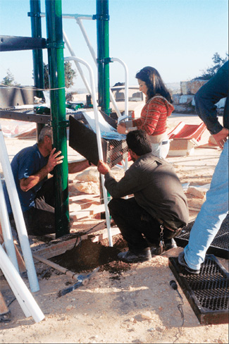 The playground equipment finally arrived in November 2002. Ms. Abulhawa and Mark Miller, a PFP affiliate, after three hours and five security checks (just on the U.S. side), flew to Israel to oversee the installation. Mark, a first time visitor to the Holy Land, penned a diary of the experience. [Editor?EUR??,,????'???s note: The construction details are gleaned from Mark?EUR??,,????'???s online diary.]