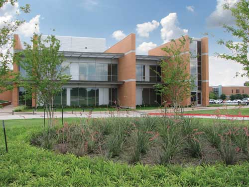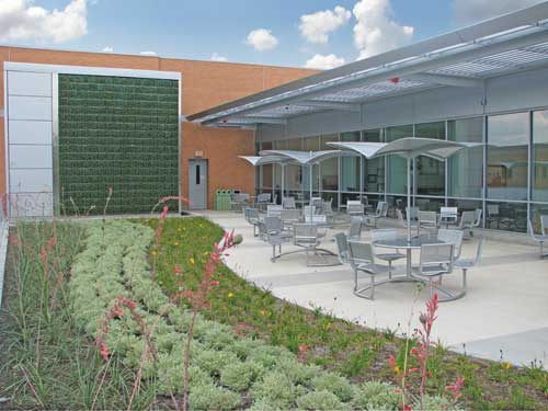 A Verdant View Red yucca, artemisia and daylilies thrive on Sabine Hall's second-floor vegetated roof. Plantings are semi-extensive, and soil depth does not exceed 5.5 inches to save water and ease any infrastructure concerns. Ample seating and a shade trellis project from the building, where students can take a grand staircase to reach the roof terrace in addition to access provided by the building's second floor. Large cast concrete planters with ornamental grasses march up the staircase, delineating the walkway. Chad Sichello of GSky Plant Systems, Inc., Vancouver, B.C., designed the green wall on the second floor. Installation required three separate phases: one for the frames, one for the irrigation system and a third for the panels. Construction was interrupted when winter weather arrived early, which prevented the panel installation until the following spring. The green wall plant-growing medium is 60 percent organic material, coated with a synthetic stabilizer to expand the life of the organic composition. The remaining 40 percent of the growing medium is a synthetic mesh that holds the organic material. The plants, euonymus Japonicus and Microphyllus, were grown by Ponto Nursery and installed by the contractor, ValleyCrest Landscape Development, Dallas. The wall has an automated winterization system with sensors that detects when temperatures are close to freezing, which shuts down the watering program. Drains located below the watering valves allow all water to gravity drain out of the lines, preventing frozen pipes. The system detects when the weather has warmed up enough to automatically open the watering to the drip lines. This smart irrigation is vital to the survival of the wall plants. This project uses myriad opportunities to teach students, faculty and visitors the value of sustainability, emphasizing Richland College's strong commitment to the sciences and the future viability of the environment. Team List Richland College Leadership Janet James, Executive Assistant to the President Eddie Hueston, Emeritus Director of Facilities Landscape Architects Linda Tycher & Associates, Inc. Linda Tycher, RLA, ASLA Architects Perkins + Will Richard Miller, AIA, LEED AP BD+C Artist Larry Kirkland Atlantis Raintank System Construction EcoServices Civil & Structural Engineers Jaster Quintanilla Construction Gilbane Green Wall System GSky Plant Systems, Inc. Landscape Contractor Valleycrest MEP Engineers Shah Smith & Associates Photographer Charles Smith