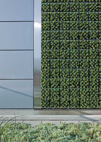 The G-Sky living wall, designed by Chad Sichello and installed by ValleyCrest Landscape Development, features euonymus Japonicus and "Microphylla'. The wall has an automated winterization program that senses when the temperature dips close to freezing and shuts down the watering system. Red yucca, "Silver Mound' artemisia and "Stella D'Oro' daylilies (left to right) unspool outward from the green wall in a curvilinear planting bed beside the seating area.