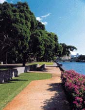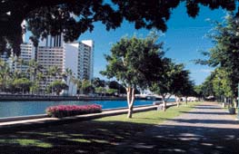 The site is a historical location, and is protected under the State Department of Land and Natural Resources. A double row of existing Banyan Trees is protected by the Exceptional Trees Program. A continuous canopy of the Banyan Trees serves as the main focus of the promenade, while bands of cascading Purple Bougainvillea provide color along the canal edge. A Hibiscus hedge provides screening from the adjacent properties. Open Zoysia "El Toro" lawn areas provide for passive recreation and picnicking. Torch and Red Gingers, planted along the base of the convention center, soften the massive basalt rock wall.