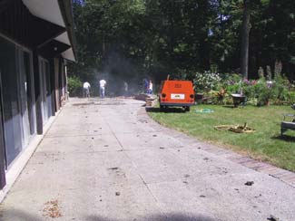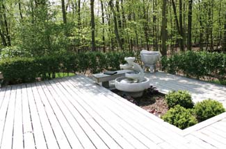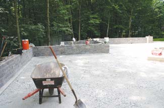 The existing wood deck, 24?EUR??,,????'?? above grade, was replaced with a large patio, a water feature and built-in BBQ grill station. Concrete foundations and an 18?EUR??,,????'?? retaining walls was built around the perimeter to hold the tonnage of gravel that raised the patio area to the necessary elevation. It required 30 yards of #14 gravel, about 37 tons, which were compacted in increments with a vibratory drum roller.
