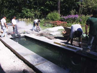 The water feature foundation, part of the wall foundation, continued around all four side to form a shell. This was filled with compacted gravel to bring the elevation up to a little over two feet. A concrete slab was then poured to form the bottom of the lower pool. The pool walls dovetail into the seatwall, both constructed of Unilock Brussels Dimensional stone. The pools interior shells received a stucco coat of waterproof concrete to seal the gaps in the segmental stone. After curing, the concrete took a coat of rubberized sealant used in water towers, just for insurance. The coping and weirs are 'lilac' bluestone mortared in place. The pump is a 1/4 hp generating 90 gpm.